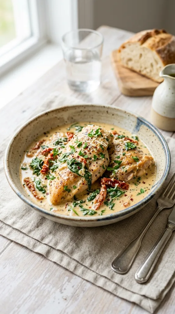 Imagine coming home to tender chicken breasts swimming in a rich and creamy sauce with sun-dried tomatoes and spinach.