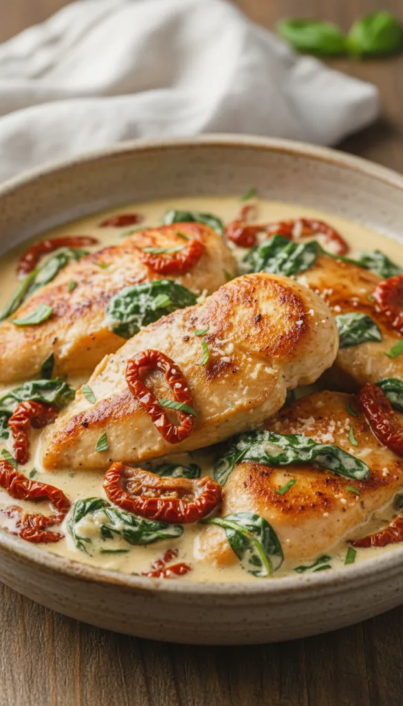 A decadent and flavorful dish that brings the taste of Tuscany to your kitchen. This creamy chicken recipe is packed with sun-dried tomatoes, spinach, and a rich Parmesan sauce, making it an instant family favorite.