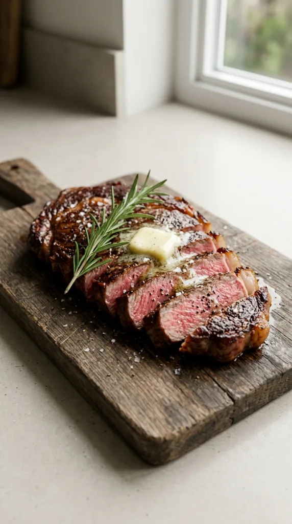 - After resting, slice the steak against the grain and serve immediately.