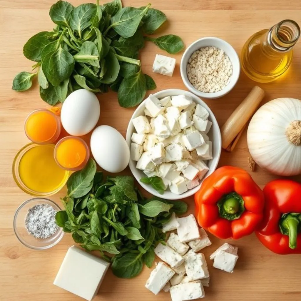 Ingredients for vegetable & feta breakfast casserole laid out on table