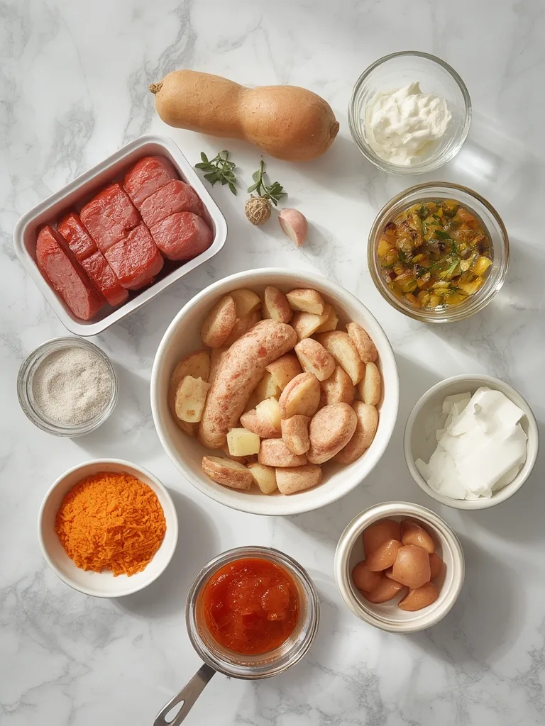 To make this unforgettable Smoked Sausage Potato Breakfast Casserole, you’ll need a few key players that bring all the savory magic together: